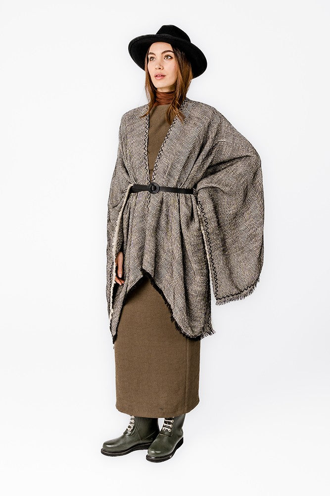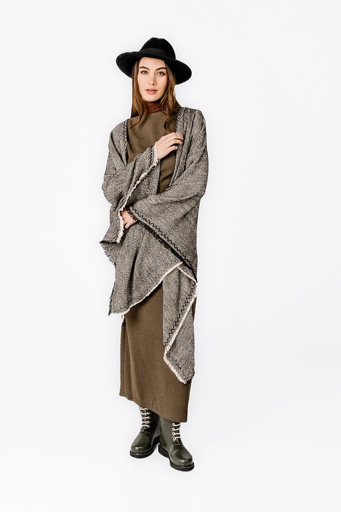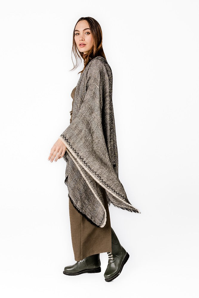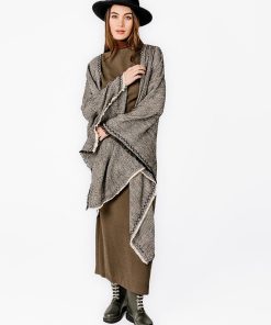 Women’s poncho with linear print in an elegant and sober style. Its fabric is ultra-soft to the touch and very warm, perfect for autumn and winter days. Its ends are frayed, and as an original detail, we can see the visible zigzag seams. A very easy to combine accessory and perfect to accompany you in the colder months. One size.