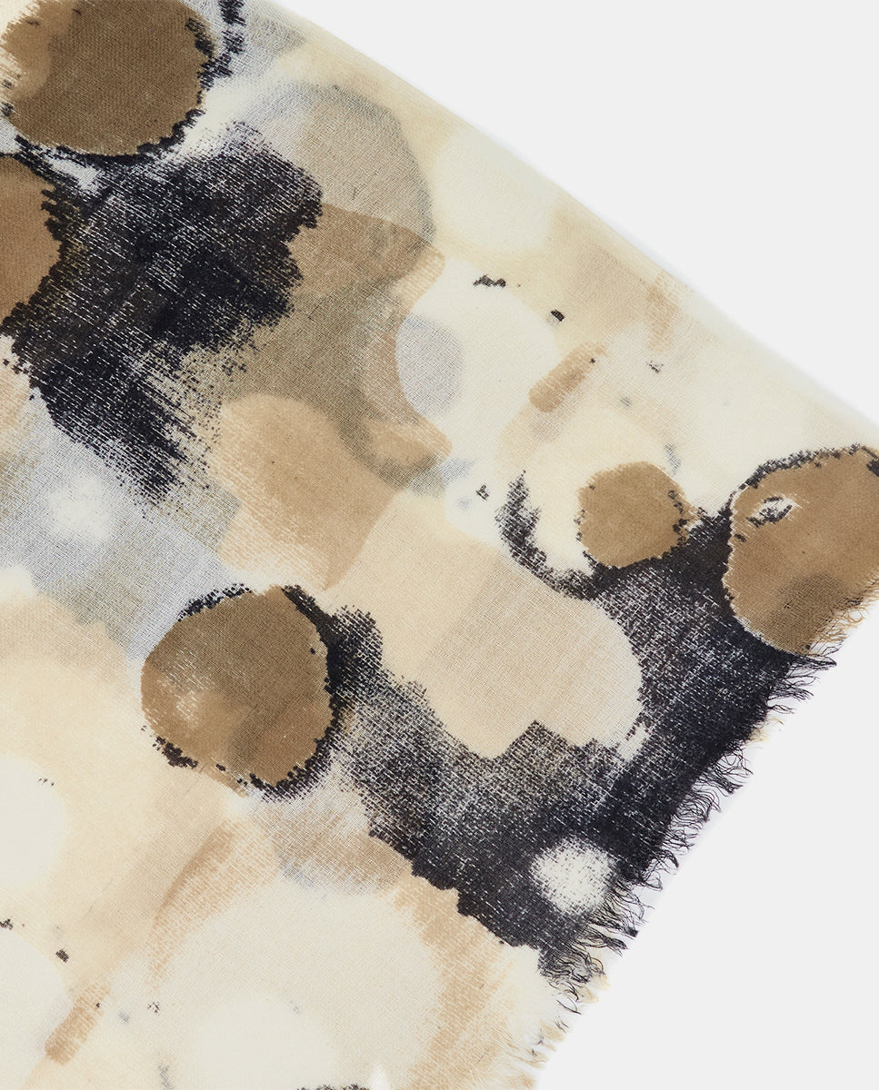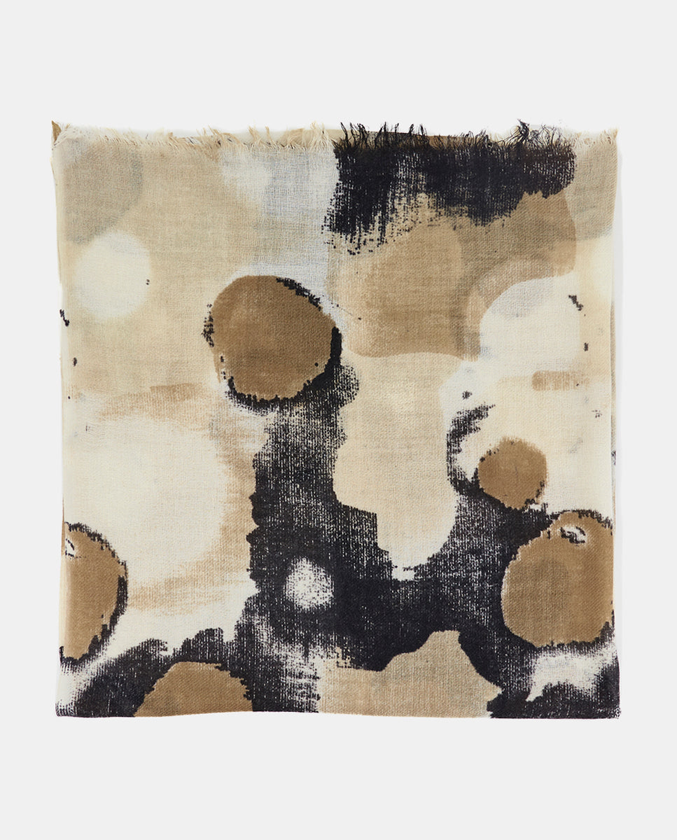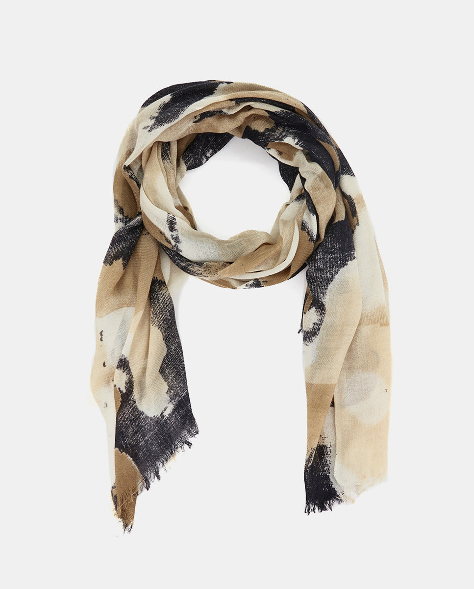 Soft, lightweight wool scarf with an abstract print. A versatile and functional accessory, ideal for any occasion. Frayed edges.