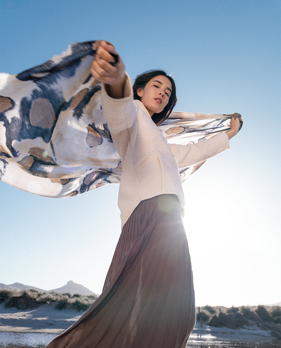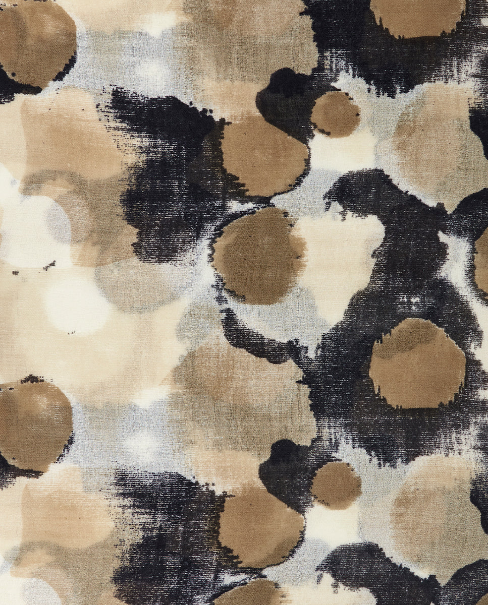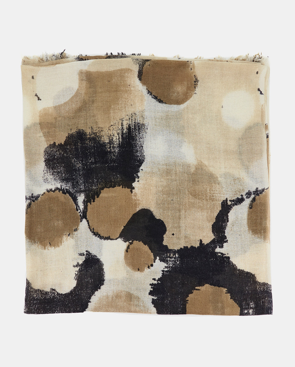 Soft, lightweight wool scarf with an abstract print. A versatile and functional accessory, ideal for any occasion. Frayed edges.