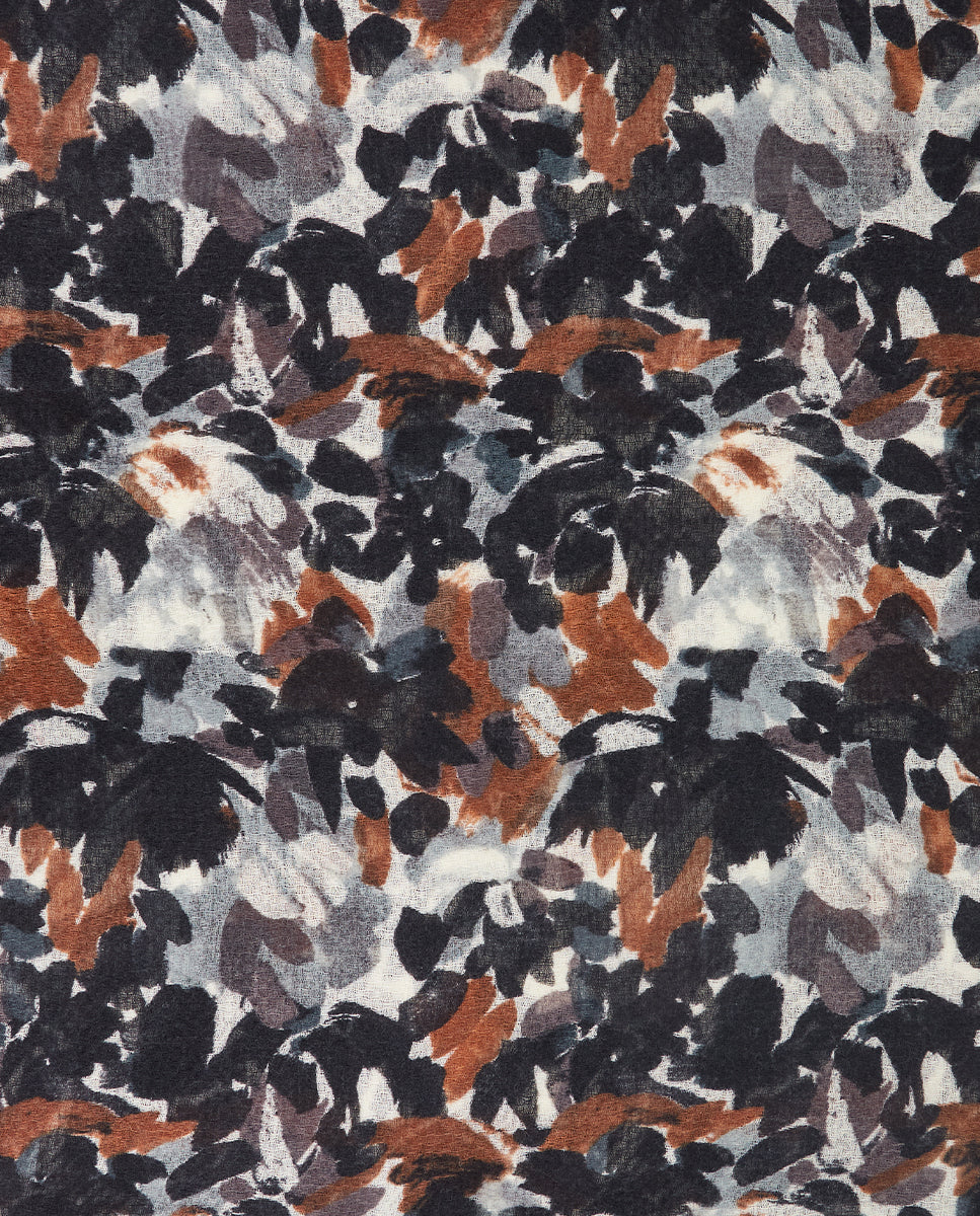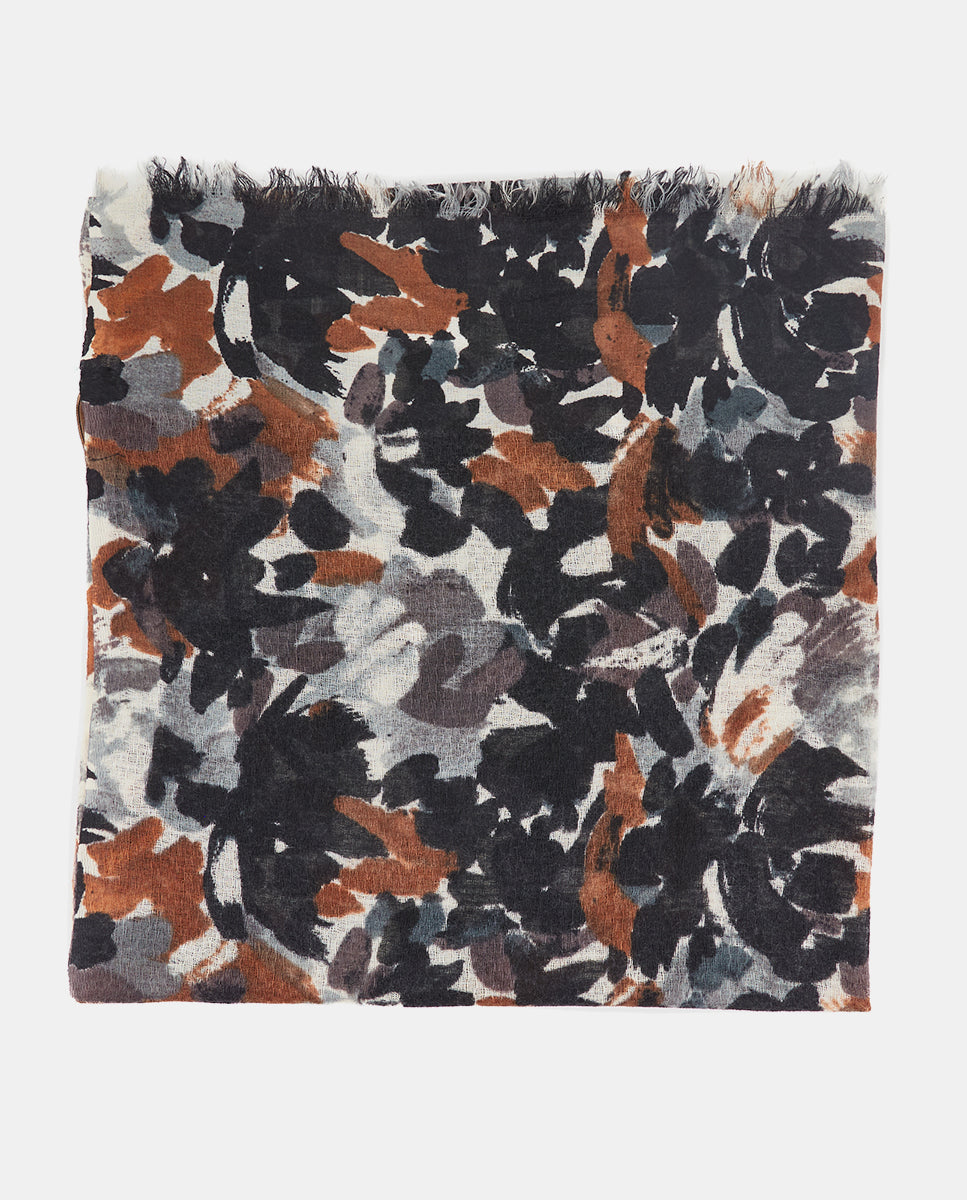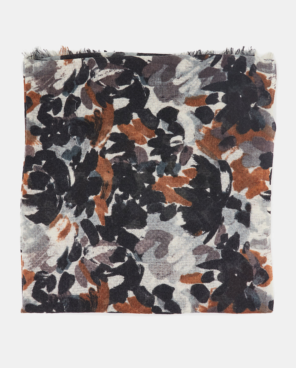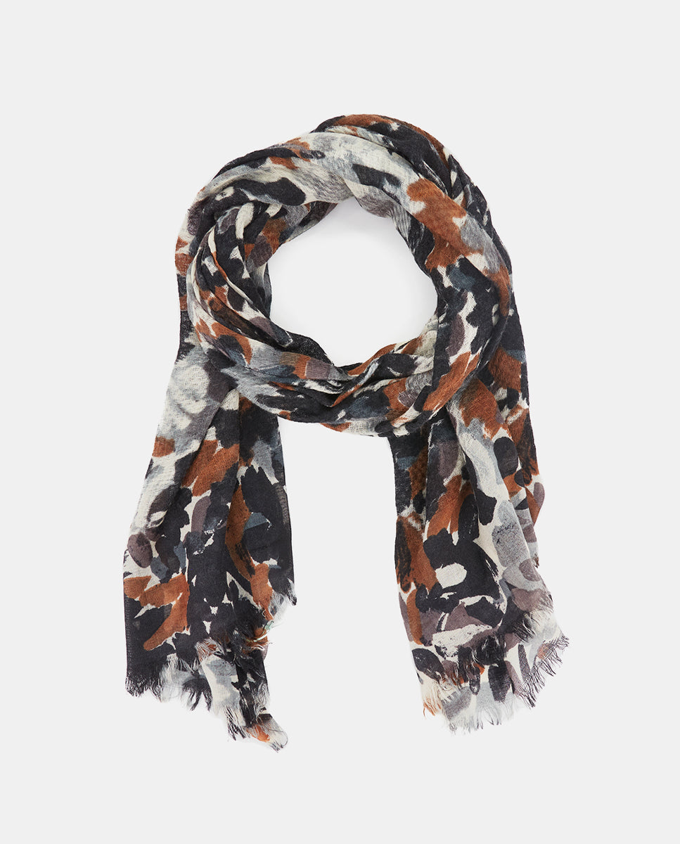 Soft, lightweight wool scarf with an abstract print. A versatile and functional accessory, ideal for any occasion. Frayed edges.