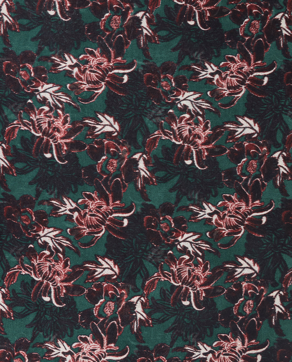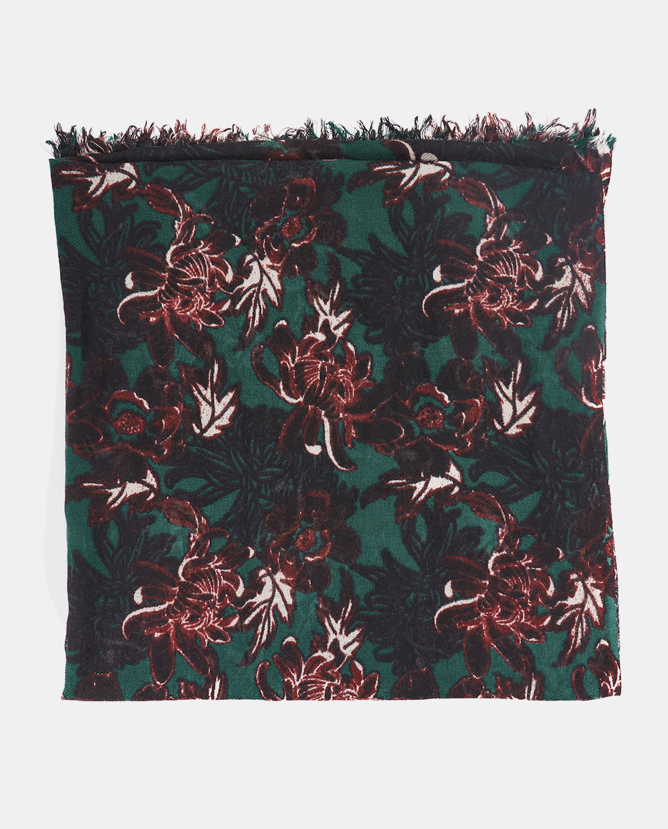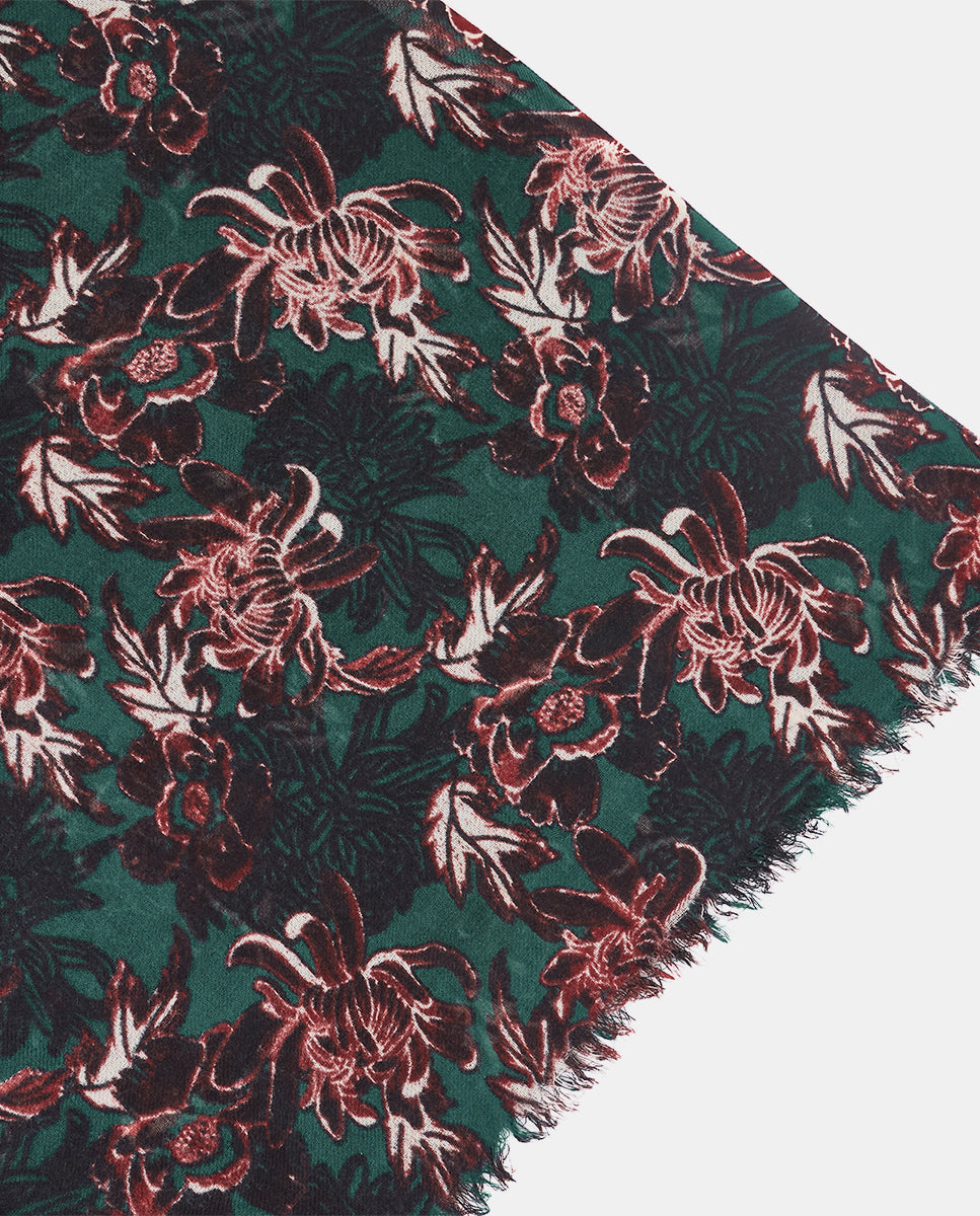 Soft, lightweight wool scarf with a floral print. A versatile and functional accessory, ideal for any occasion. Frayed edges.