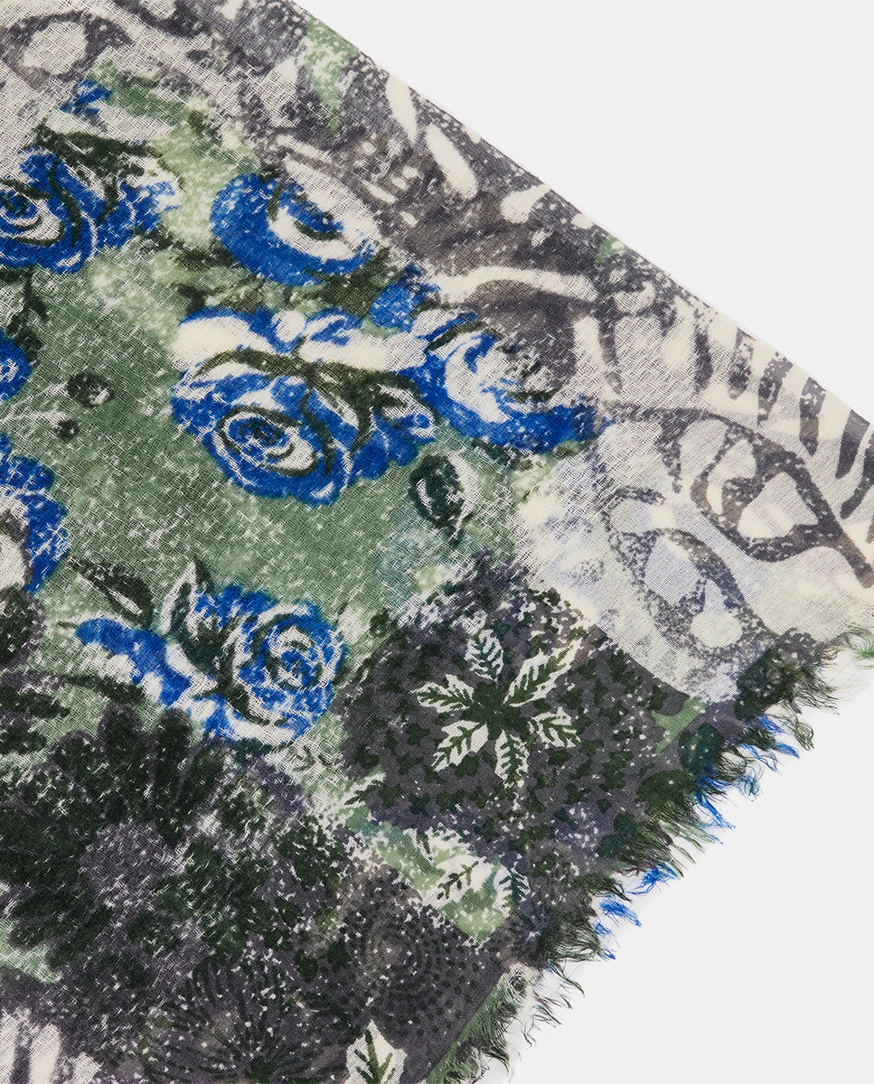 Soft, lightweight wool scarf with an abstract print. A versatile and functional accessory, ideal for any occasion. Frayed edges.