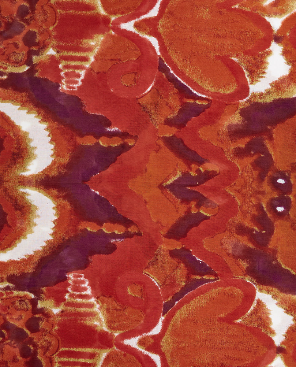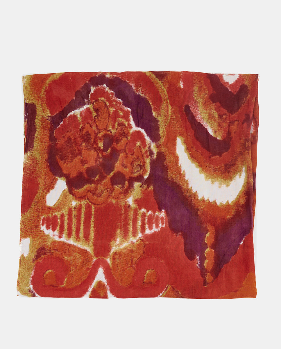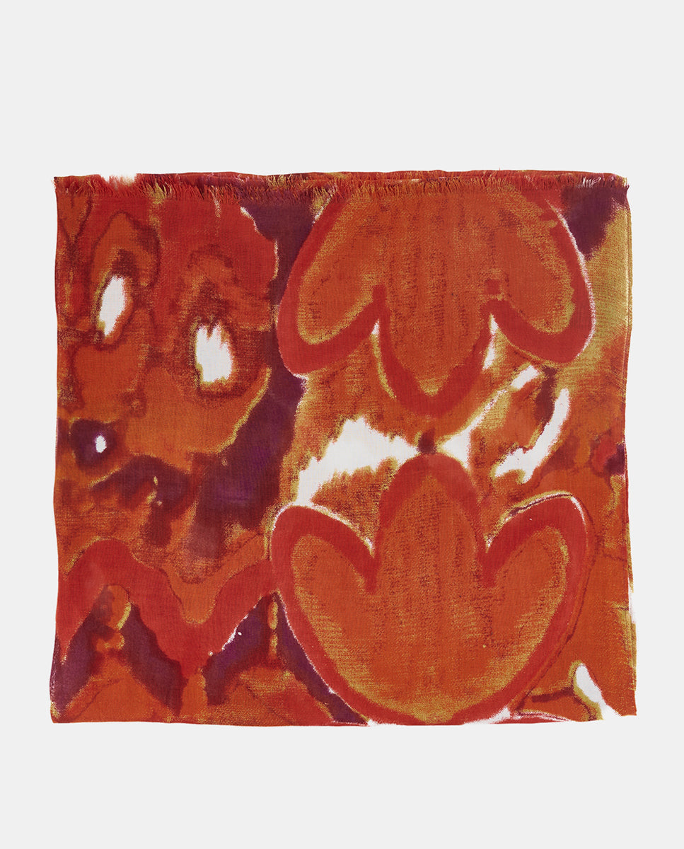 Soft, lightweight wool scarf with an abstract print. A versatile and functional accessory, ideal for any occasion. Frayed edges.
