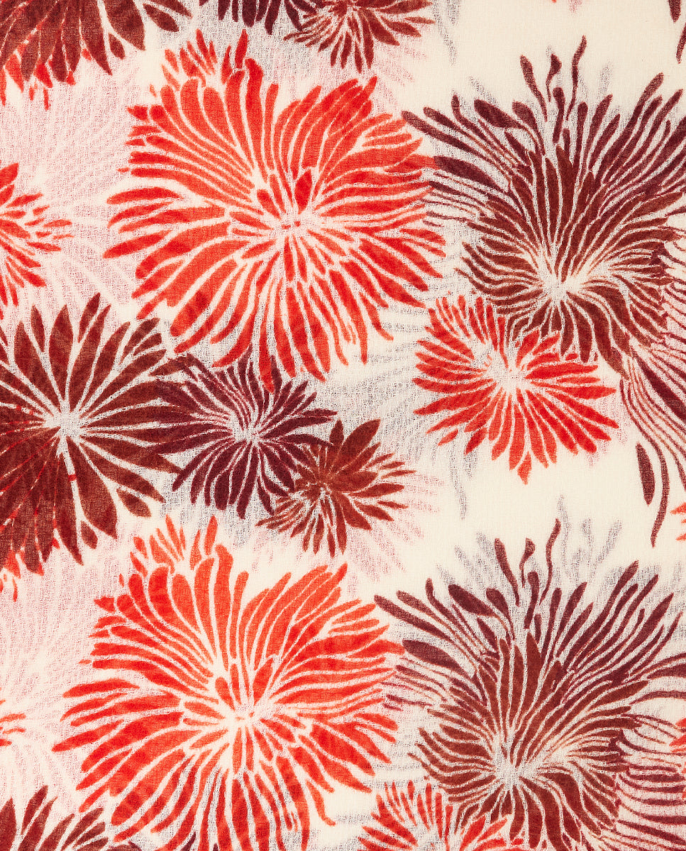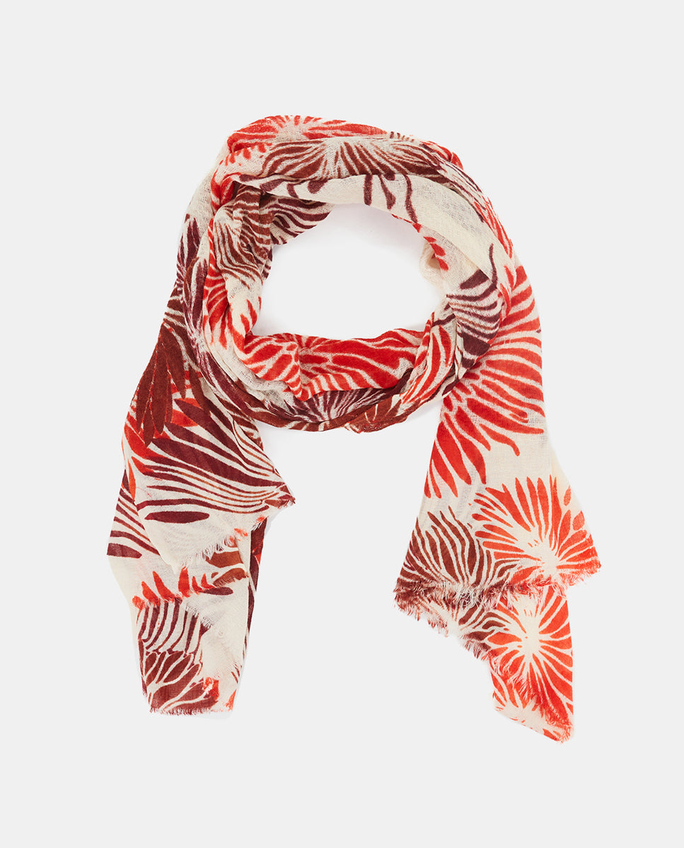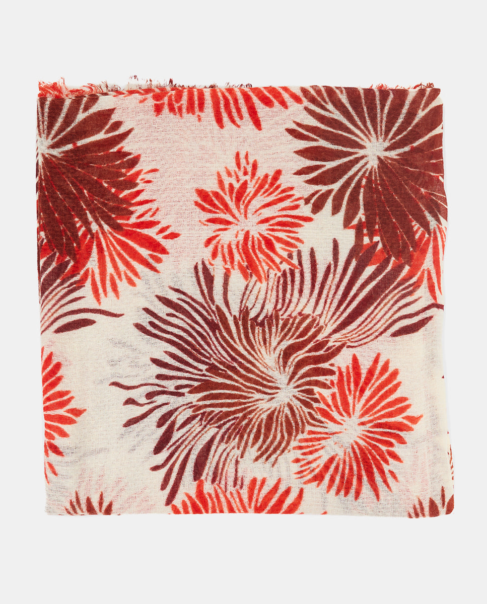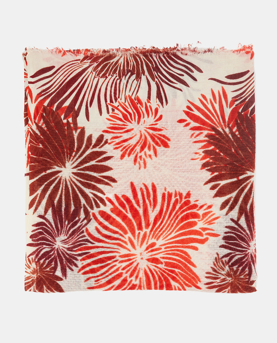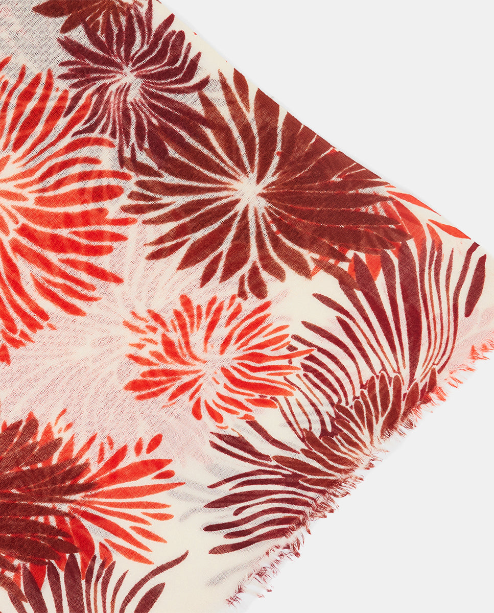 Soft, lightweight wool scarf with a maxi floral print. A versatile and functional accessory, ideal for any occasion. Frayed edges.