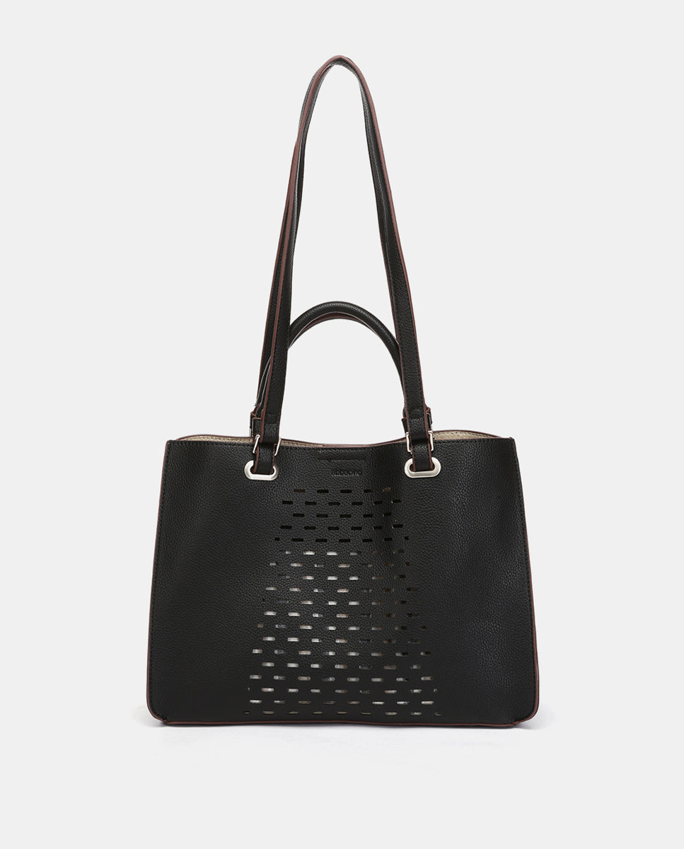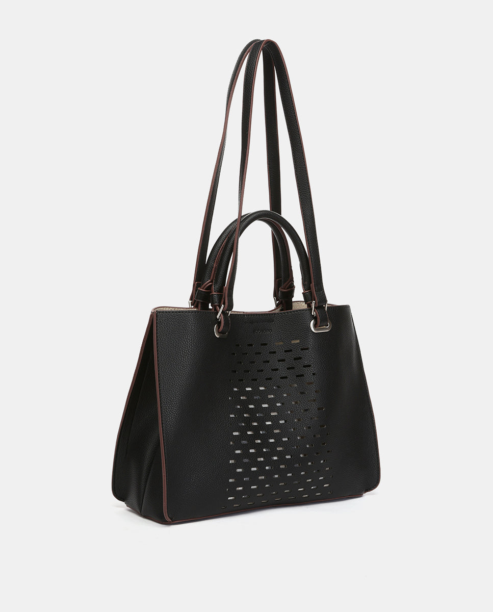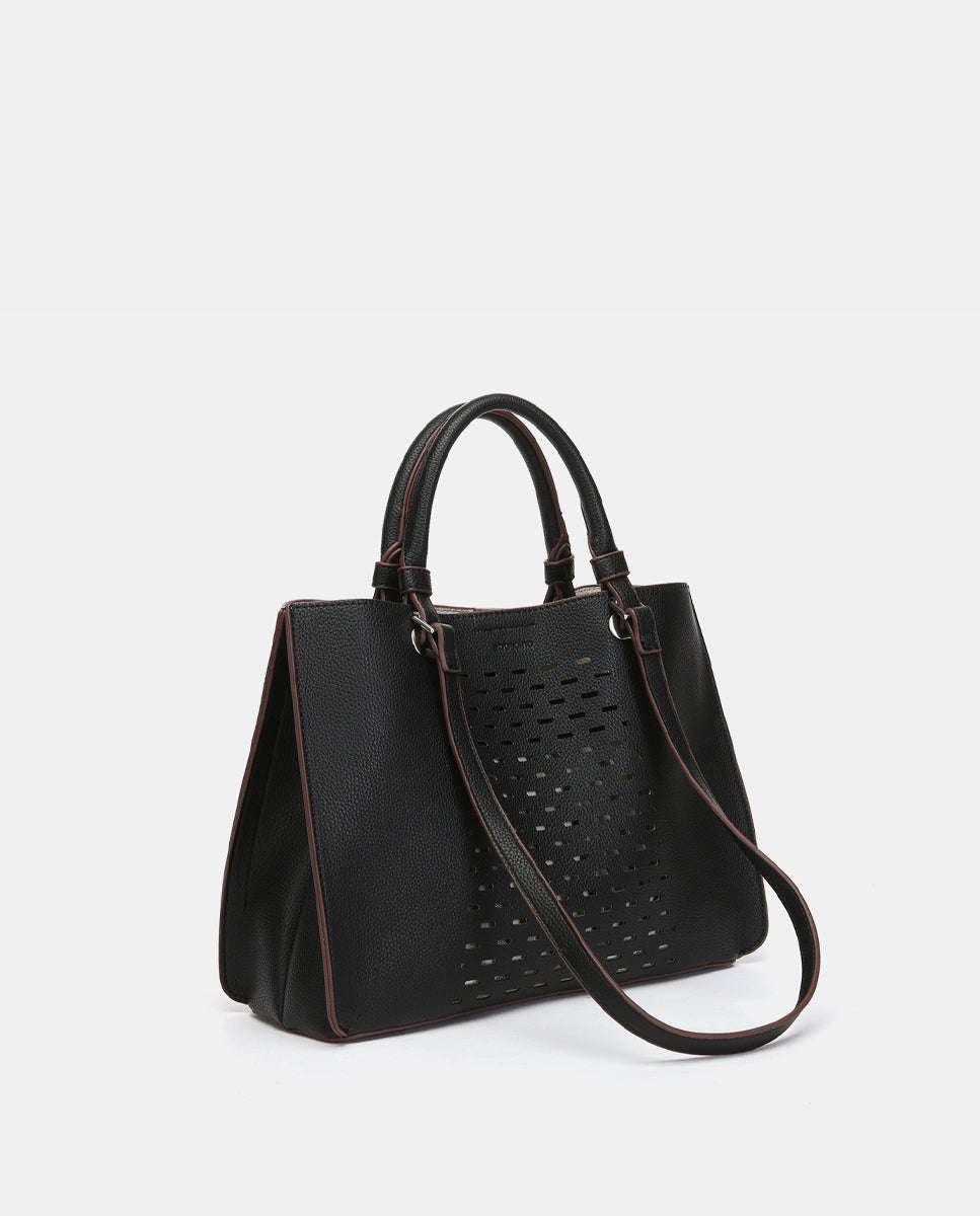 Lady-style handbag made from recycled materials, featuring a beautiful cut-out design on the front. A very feminine model with an elegant air and well-crafted finishes. Its main features are: