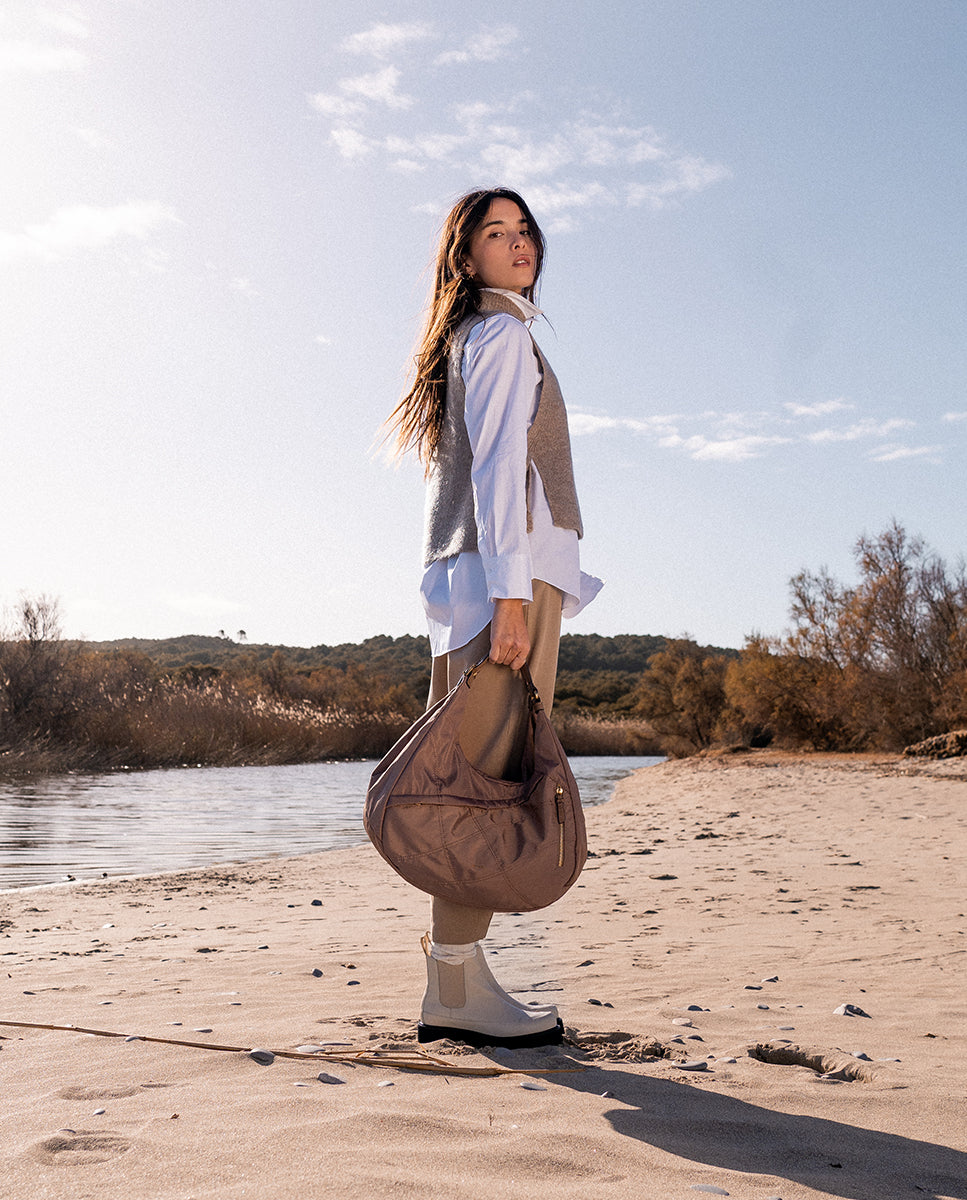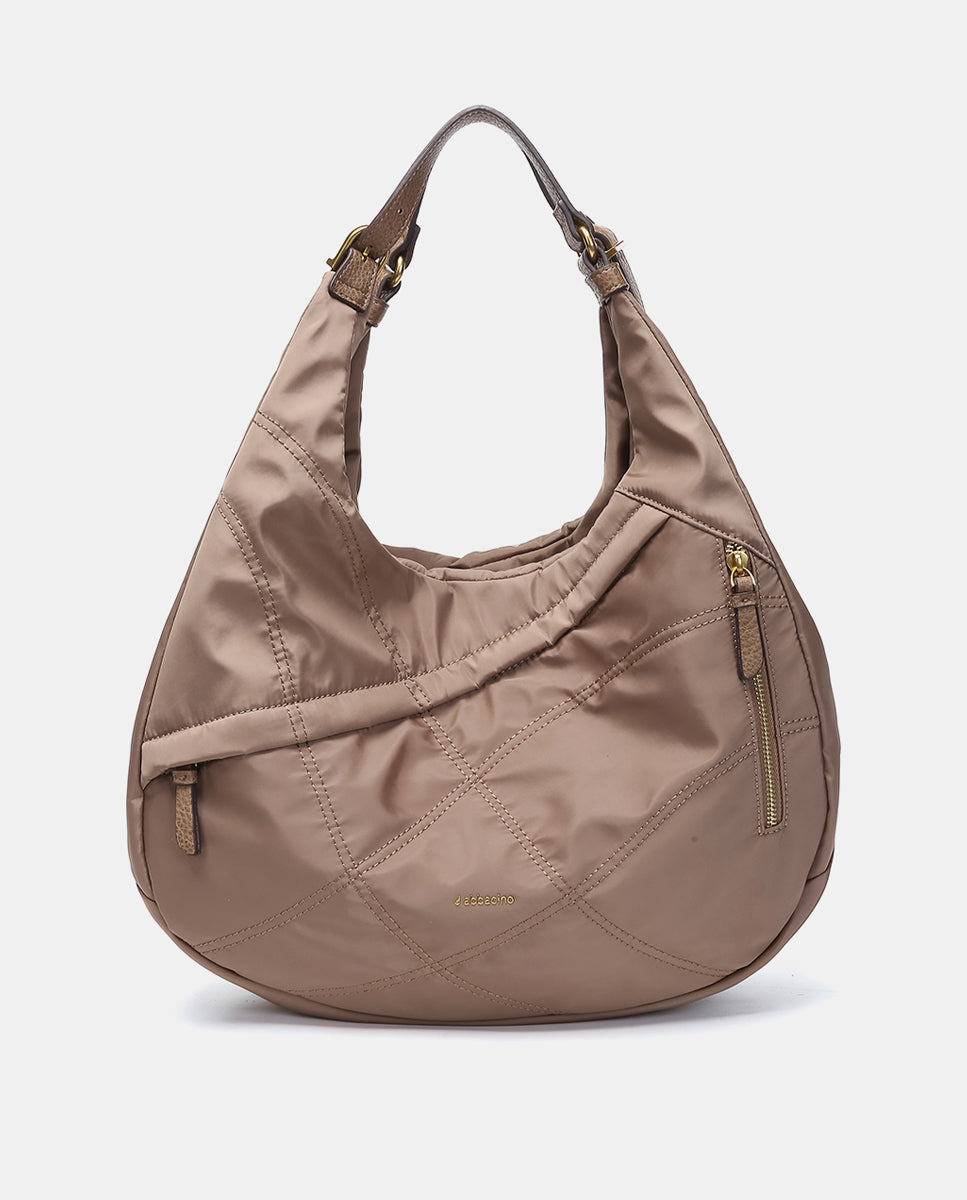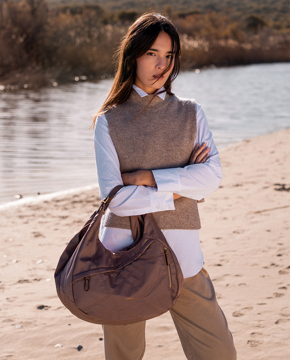 Women’s hobo-style shoulder bag made from recycled fabric with a satin finish. Sporty and functional, it’s ideal for fall and winter thanks to its seasonal colors. Practical and stylish, it’s perfect for everyday wear. Its main features are: