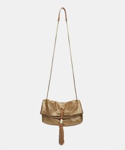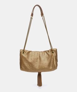 • Its metallic handles are adjustable, allowing them to be used as shoulder straps or a crossbody strap.