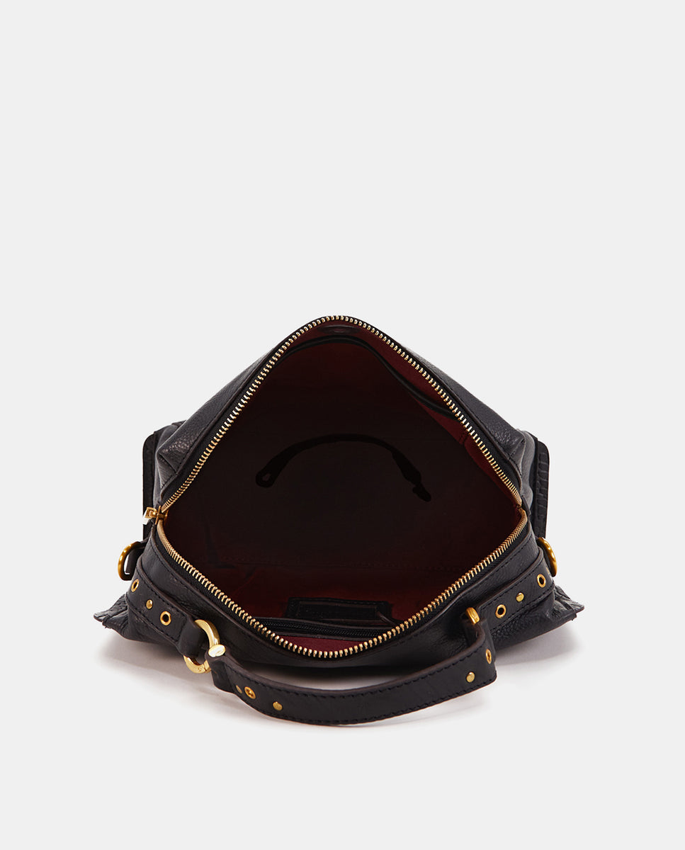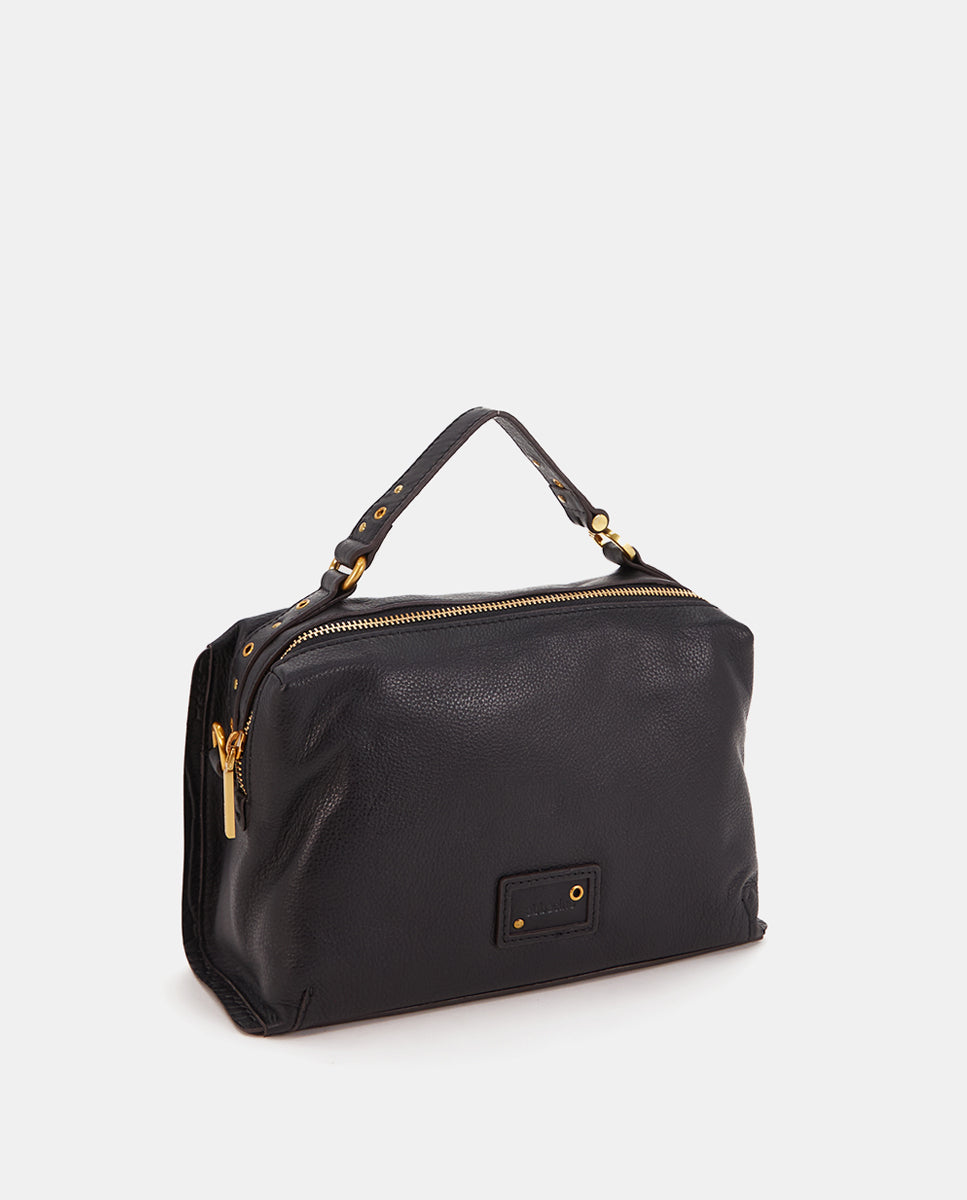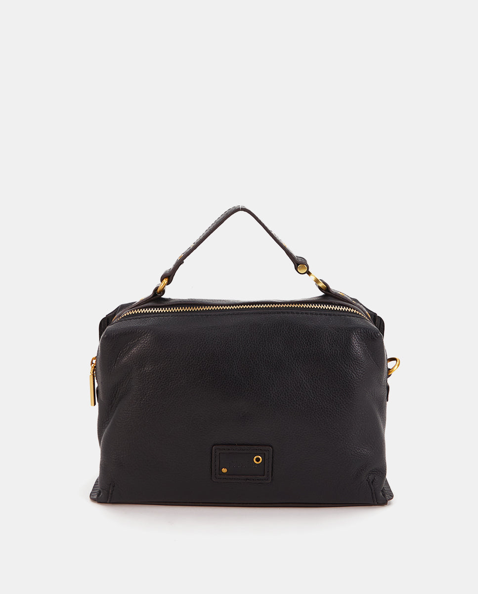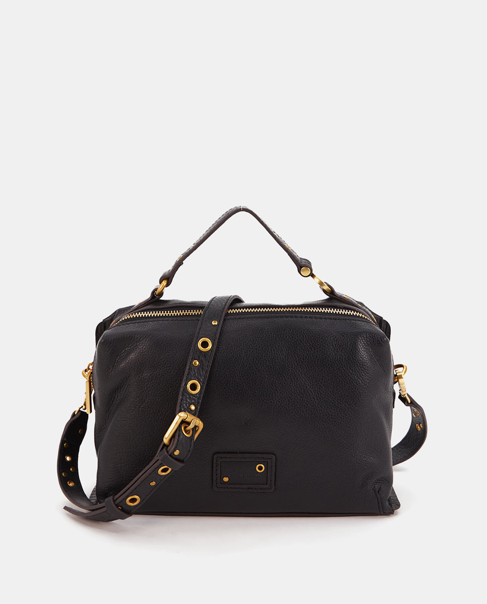 • Top handle and adjustable crossbody strap decorated with gold hardware.
