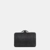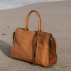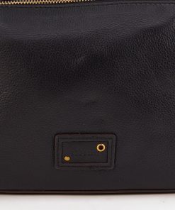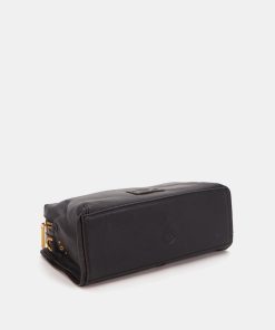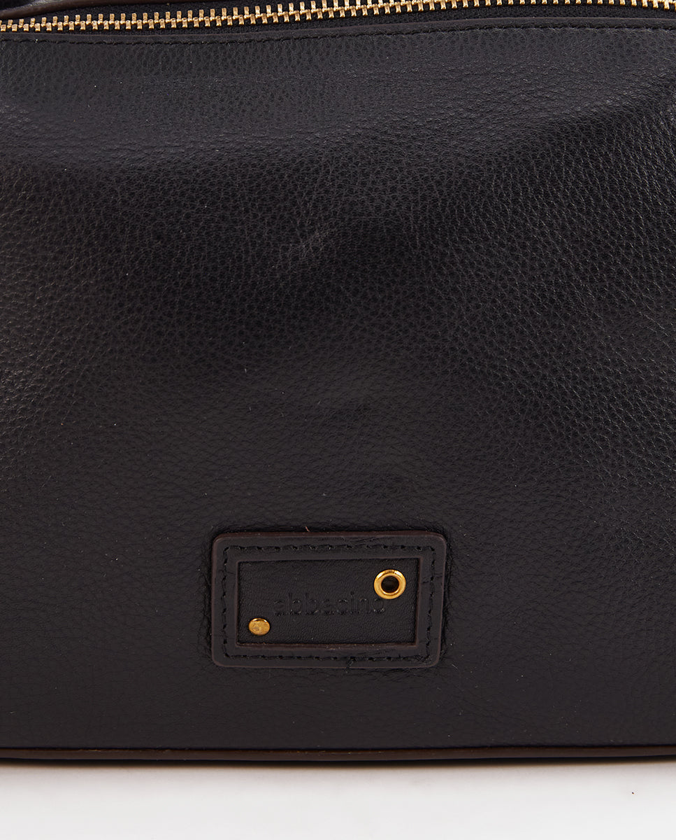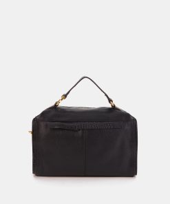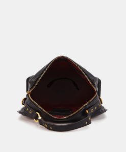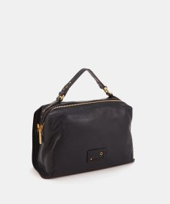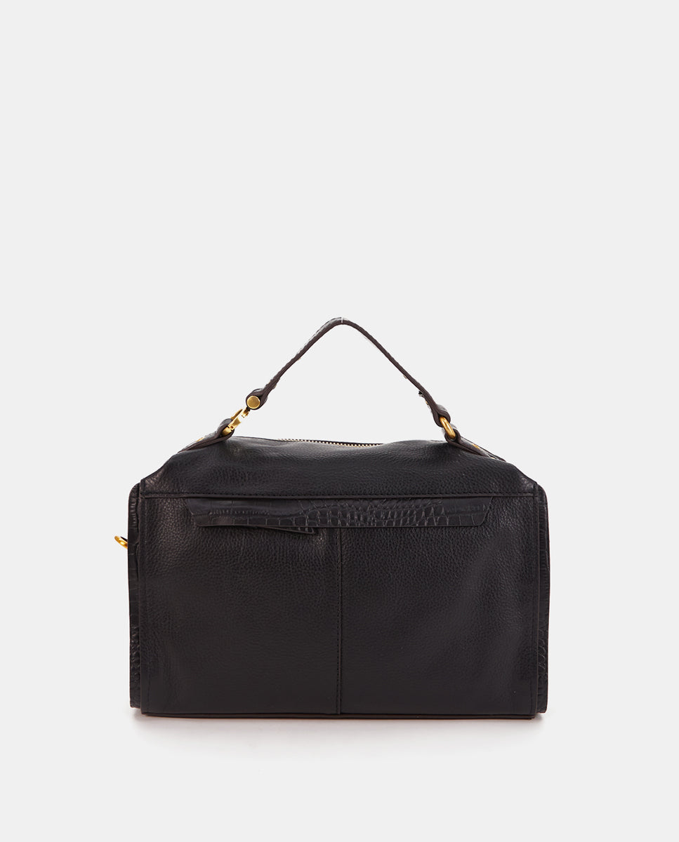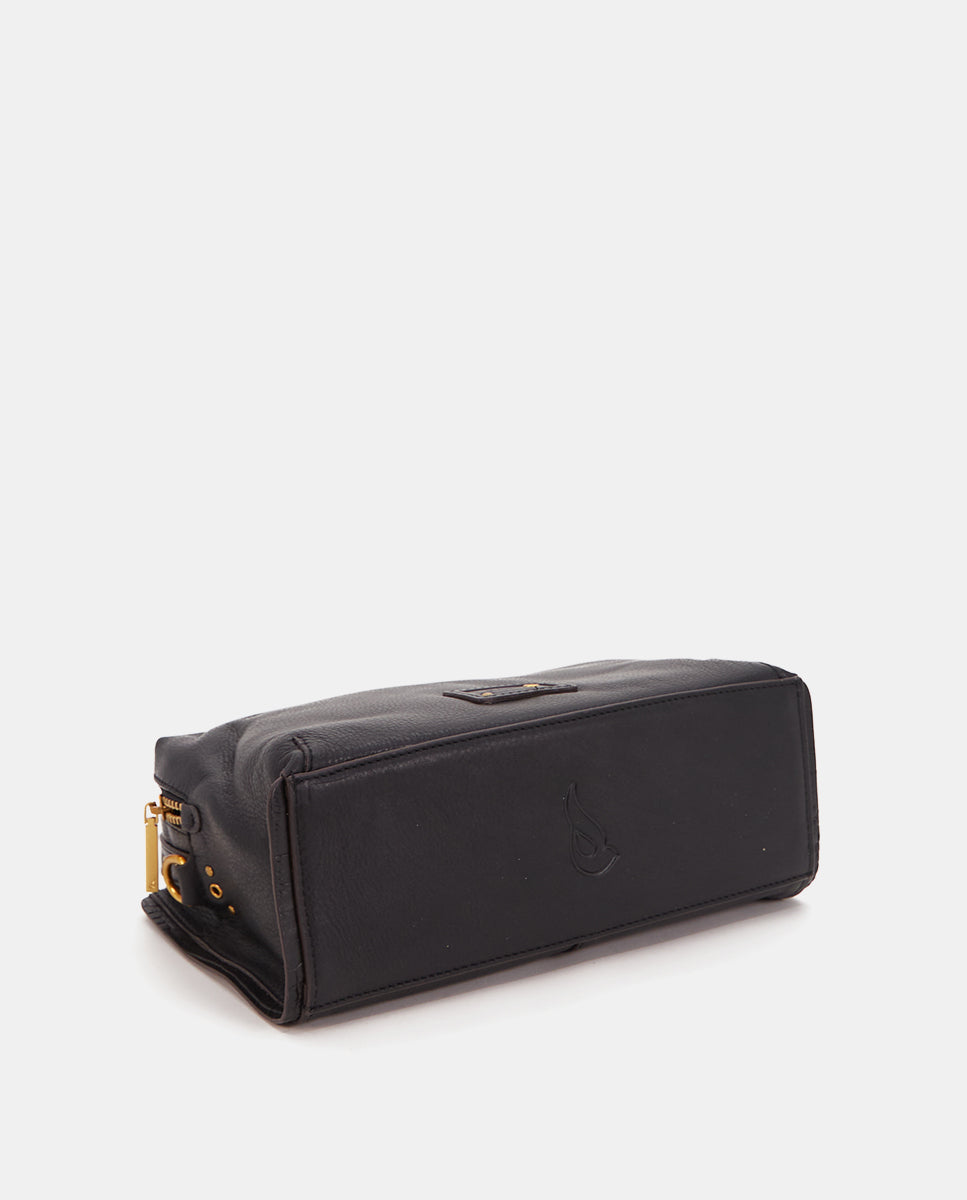 • Top handle and adjustable crossbody strap decorated with gold hardware.