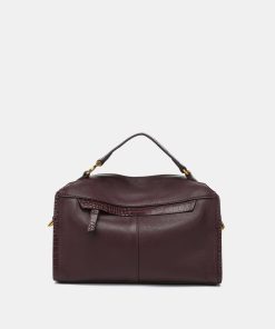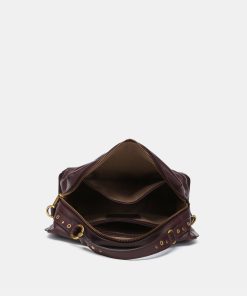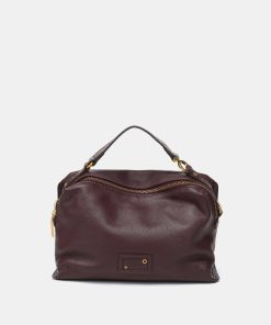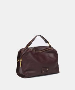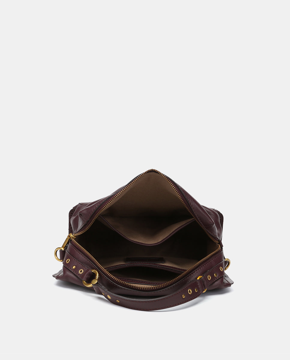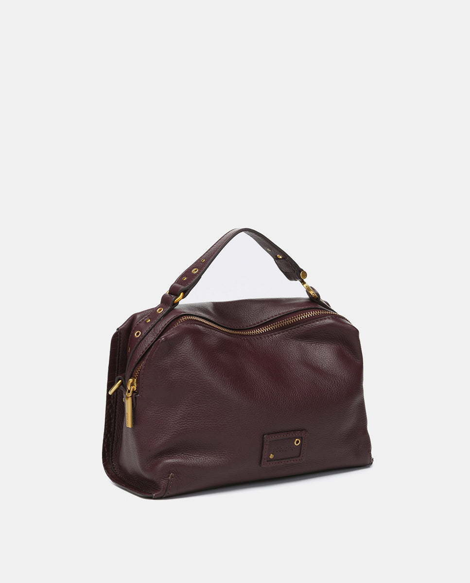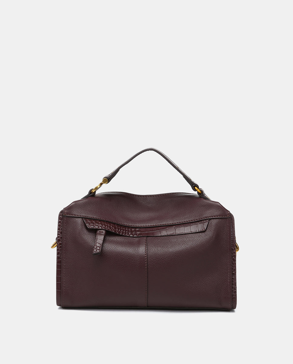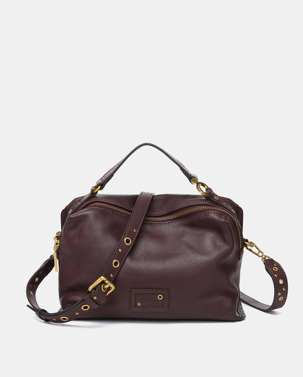 • Top handle and adjustable crossbody strap decorated with gold hardware.